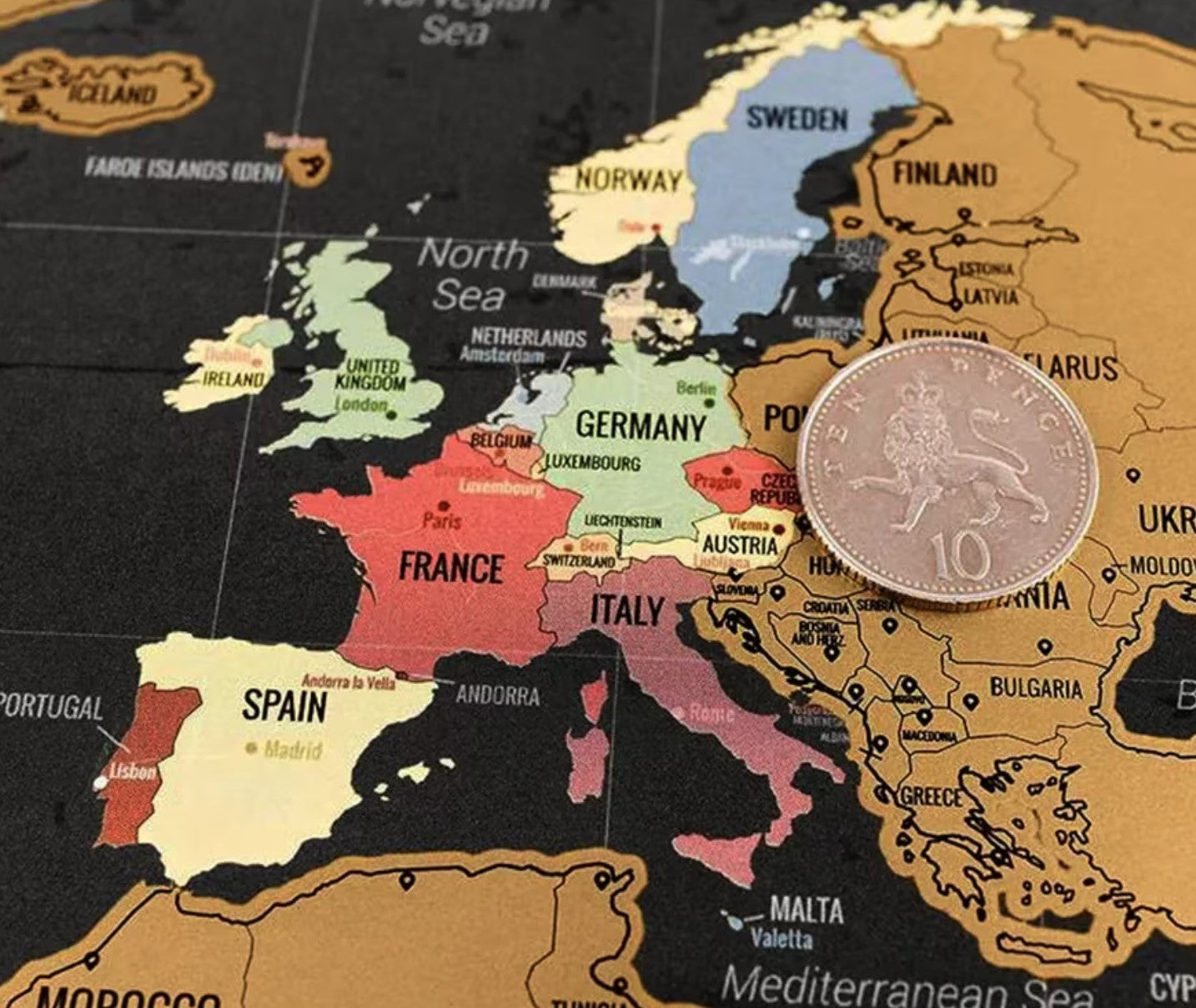 • Detailed Geography: Each scratch reveals not just lively colours but also crisply detailed country names and their capitals, serving as a vibrant reminder of your adventures and a guide for future explorations.
